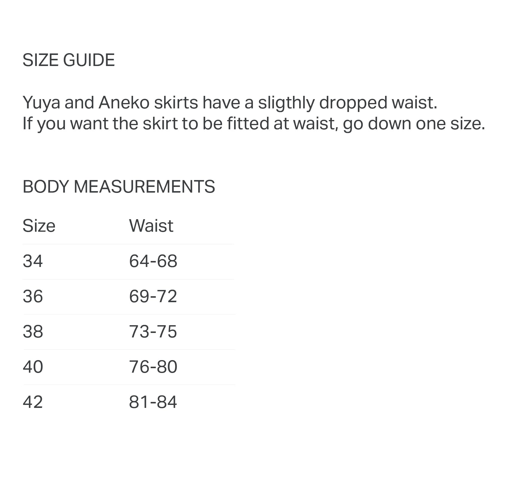 Storleken du väljer är preliminär. När du lagt din beställning får du ett mail inom 1-3 arbetsdagar där vi efterfrågar dina mått och önskat leveransdatum. Kjolarnas mått justeras därefter.